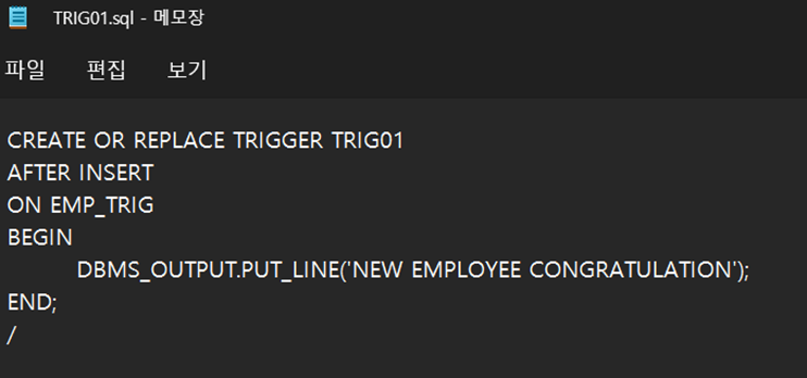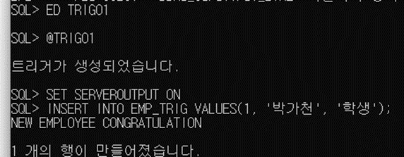 트리거를 작성하였다. EMP_TRIG에 새로운 투플이 삽입되면 영어로